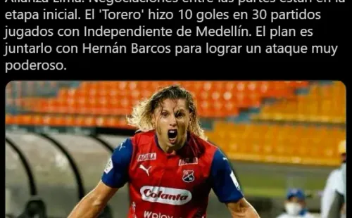 “El delantero argentino Agustín Vuletich se aproxima a Alianza Lima. Las negociaciones entre las partes están en la etapa inicial. El ‘Torero’ hizo 10 goles en 30 partidos jugados con Independiente de Medellín. El plan es juntarlo con Hernán Barcos para lograr un ataque muy poderoso”. Fue lo que comentó en Twitter el periodista del Diario Líbero, José Varela.