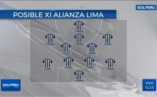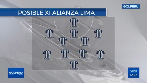 Con esta información, GOLPERU se animó a armar un tentativo once que disputaría la Copa Libertadores. Teniendo a Ángelo Campos en el arco; Gino Peruzzi, Yordi VÍlchez, Santiago García y Ricardo Lagos en la defensa; Josepmir Ballón, Jairo Concha, Gabriel Costa, Pablo Lavandeira y Andrés Andradeen la volante y Pablo Sabbagcomo único centrodelantero.