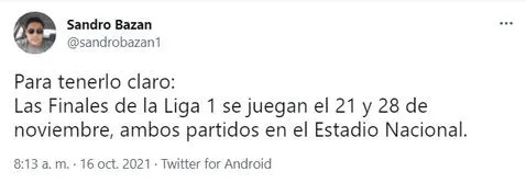 “Para tenerlo claro: Las Finales de la Liga 1 se juegan el 21 y 28 de noviembre, ambos partidos en el Estadio Nacional”. Mencionó el periodista del ‘Grupo La República’. Además de revelar, la opción de que se jueguen estos partidos con un aforo de público. Lo cual dependerá al ciento por ciento de las organizaciones estatales de nuestro país.