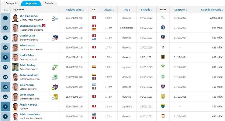 “1) AL = €17,08 M. 2) Cristal = €14,85 M. 3) Universitario = €12,30 M. 4) Melgar = €11,58 M. 5) UCV = €9,18 M”. Ese es el top de equipos mejor valorizados por sus jugadores en la plantilla actual. Ahora la pregunta gigante que aparece, es si lo podrán reflejar en el campo de juego. De eso se encargará el buen Guillermo Salas, conocido por como El Chicho. Veremos.