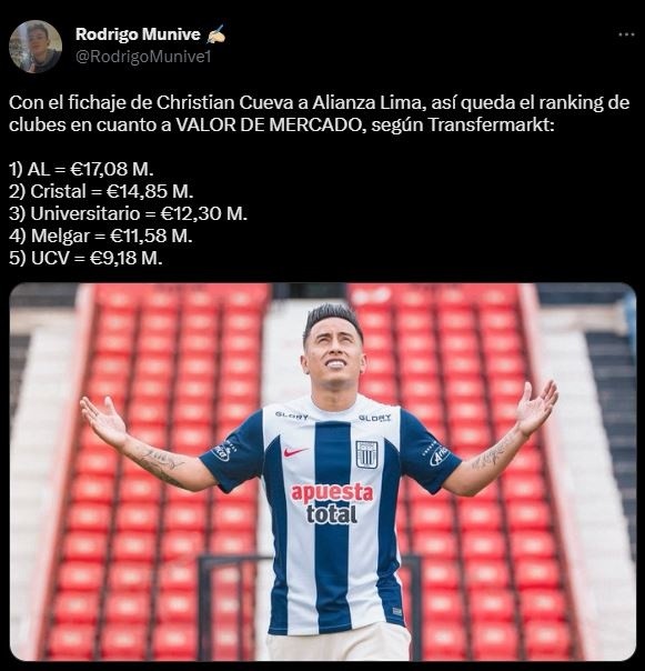 “Con el fichaje de Christian Cueva a Alianza Lima, así queda el ranking de clubes en cuanto a VALOR DE MERCADO, según Transfermarkt”. Comienza señalando el comunicador social, para después soltar las cifras del portal internacional, el cual está contrastado con nombres y cantidades aproximadas. Relevante información.