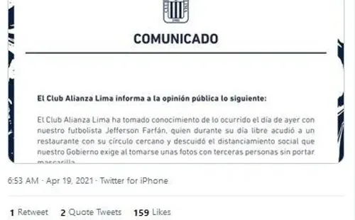Nair Aliaga, de GolPerú y Ovación, señaló al club compartiendo la imágen de Alianza: “Este comunicado debe ser una broma, ¿no?”. “Para los hinchas de Alianza. Exijan que cualquier jugador que llegue al club sea profesional y respete los protocolos. Sin importar quien sea, nadie debería estar por encima de su institución. (Mi opinión)“, complementó en otro tweet.