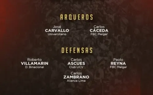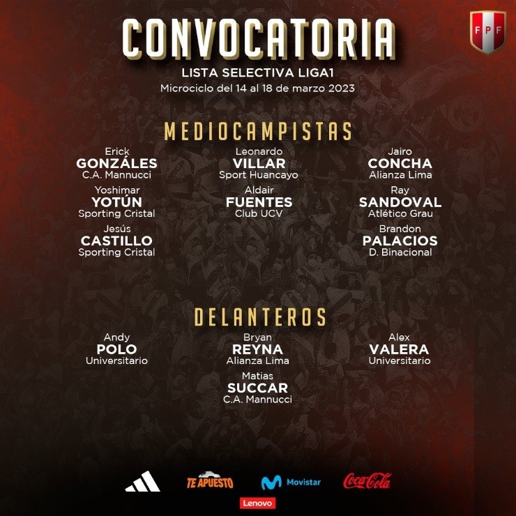 Delanteros: Andy Polo (Universitario), Bryan Reyna (Alianza Lima), Matías Succar (Carlos A. Mannucci), Alex Valera (Universitario).