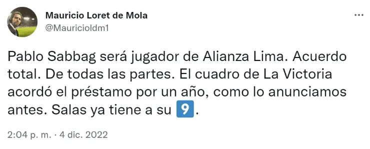 Asimismo, de acuerdo a Mauricio Loret de Mola, el acuerdo ya está cerrado y solo faltaría la firma para que se oficialice. Adicionalmente, confirmó que llegará en calidad de préstamo durante una temporada.