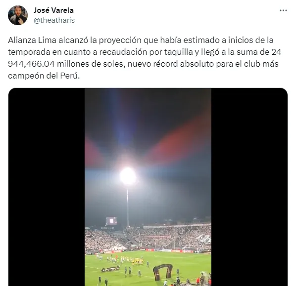 “Alianza Lima alcanzó la proyección que había estimado a inicios de la temporada en cuanto a recaudación por taquilla y llegó a la suma de 24 944,466.04 millones de soles, nuevo récord absoluto para el club más campeón del Perú”, escribió el comunicador.