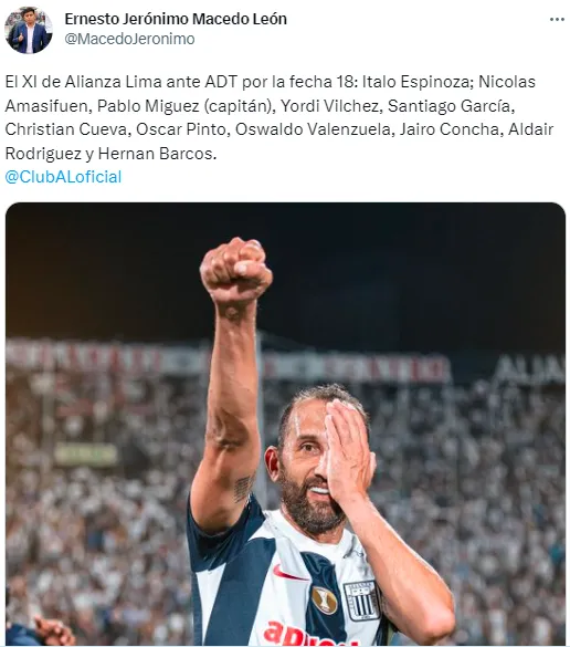 “Italo Espinoza; Nicolas Amasifuen, Pablo Miguez (capitán), Yordi Vilchez, Santiago García, Christian Cueva, Oscar Pinto, Oswaldo Valenzuela, Jairo Concha, Aldair Rodriguez y Hernan Barcos”, indicó el comunicador.