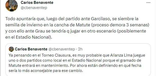 Al respecto y ante la imposibilidad de que Alianza Lima utilice Matute algunas fechas, el periodista Carlos Benavente, señaló que la directiva ha definido usar el estadio Nacional.