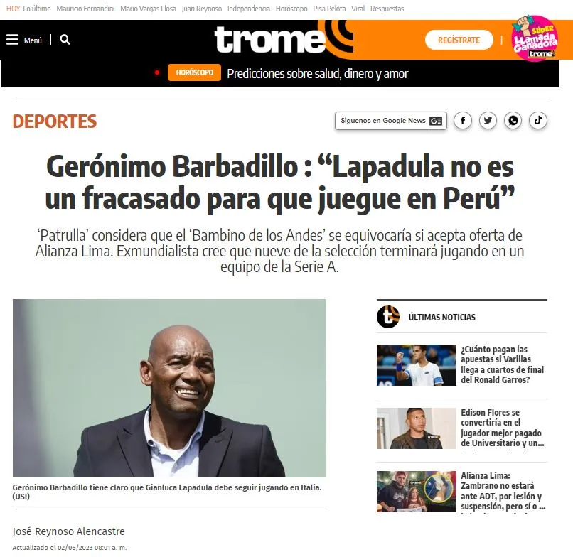 Genial es tener un punto de referencia como el gran Patrulla Barbadillo, quien es siempre el objeto consultivo para los medios de comunicación. Esta vez eso sucede por la posible llegada de Gianluca Lapadula a Alianza Lima ¿Es esto viable como se viene hablando estos días en la prensa nacional?.