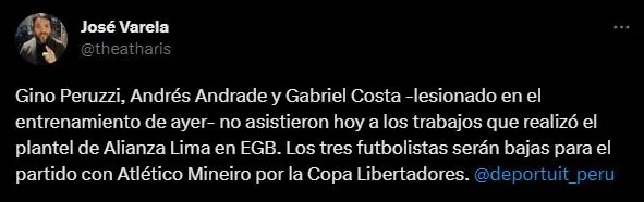 Nos la presenta el buen José Varela, en su reporte para el Diario Depor. Alianza Lima es un hospital: “Gino Peruzzi, Andrés Andrade y Gabriel Costa -lesionado en el entrenamiento de ayer- no asistieron hoy a los trabajos que realizó el plantel de Alianza Lima en EGB. Los tres futbolistas serán bajas para el partido con Atlético Mineiro por la Copa Libertadores”.