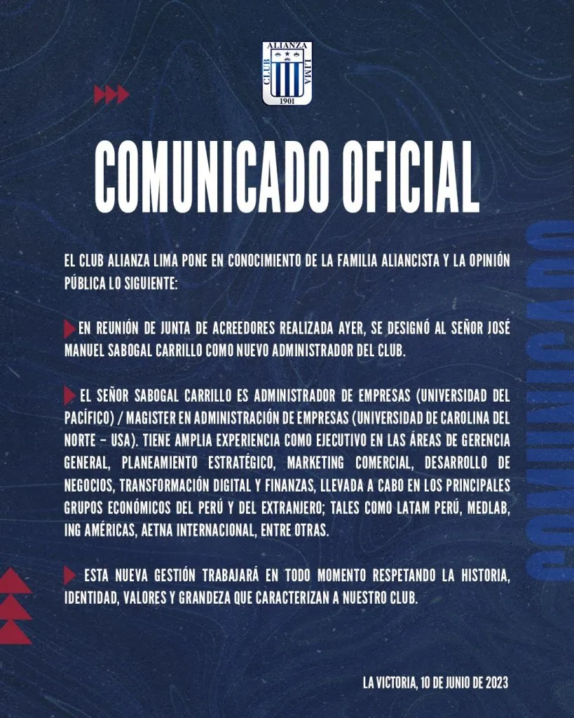 Alianza Lima, por ese motivo, definió quien será su reemplazante, después de una jornada casi maratónica. Donde han expuesto el nombre del profesional y sus aptitudes: “En reunión de junta de acreedores realizada ayer, se designó al señor José Manuel Sabogal Carrillo como nuevo administrador del club”.