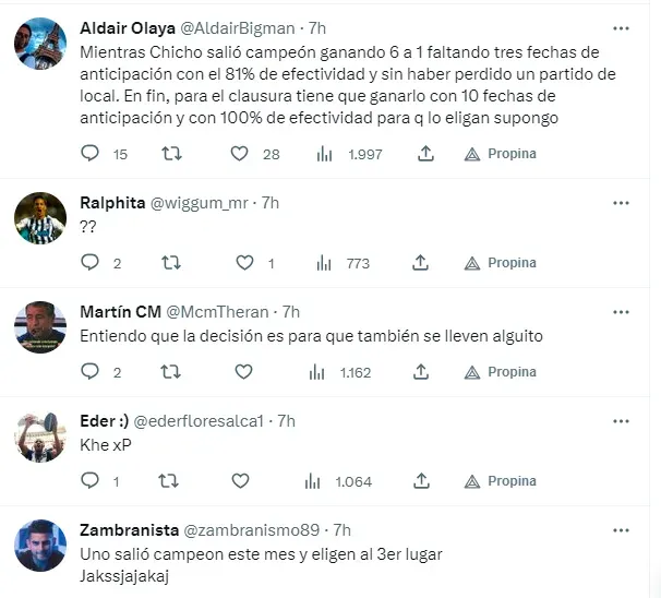 “Mientras Chicho salió campeón ganando 6 a 1 faltando tres fechas de anticipación con el 81% de efectividad y sin haber perdido un partido de local. En fin, para el clausura tiene que ganarlo con 10 fechas de anticipación y con 100% de efectividad para que lo elijan supongo”.