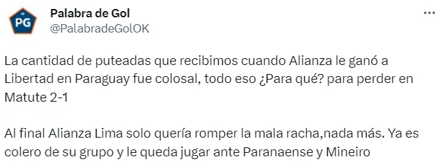 “Al final Alianza Lima solo quería romper la mala racha, nada más. Ya es colero de su grupo y le queda jugar ante Paranaense y Mineiro”, publicaron en sus redes sociales.