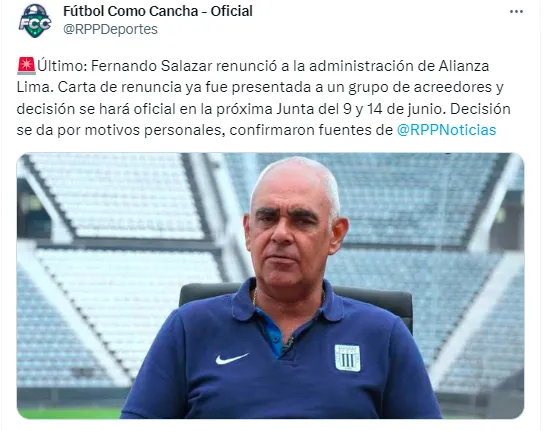 “Último: Fernando Salazar renunció a la administración de Alianza Lima. La carta de renuncia ya fue presentada a un grupo de acreedores y la decisión se hará oficial en la próxima Junta del 9 y 14 de junio. Decisión se da por motivos personales”, escribieron en su cuenta de Twitter.