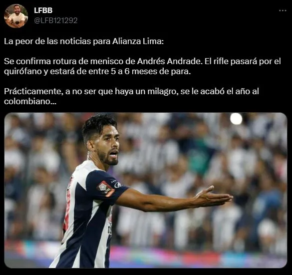 Lo que mencionó el comunicador social, es claro: “La peor de las noticias para Alianza Lima: se confirma rotura de menisco de Andrés Andrade. El rifle pasará por el quirófano y estará de entre 5 a 6 meses de para. Prácticamente, a no ser que haya un milagro, se le acabó el año al colombiano”.