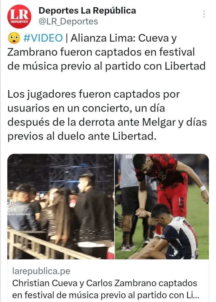 “A través de las redes sociales, hinchas compartieron imágenes en las que se ve a ambos elementos del plantel de ‘Chicho’ Salas en el Reggaetón Lima Festival, precisamente poco después del resultado que impidió la consagración de los ‘blanquiazules’ en la Liga 1 2023”. Para precisar, el evento en mención se dio cita el 20 de mayo, y el partido fue el 23 de mayo.