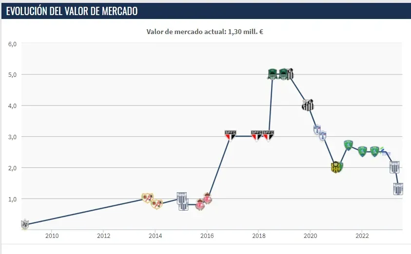 Tanto así que la última revisión de Transfermarkt sobre su costo es a la baja. Llegando a valer en su mejor momento 5 millones de euros, hoy su costo está en declive.