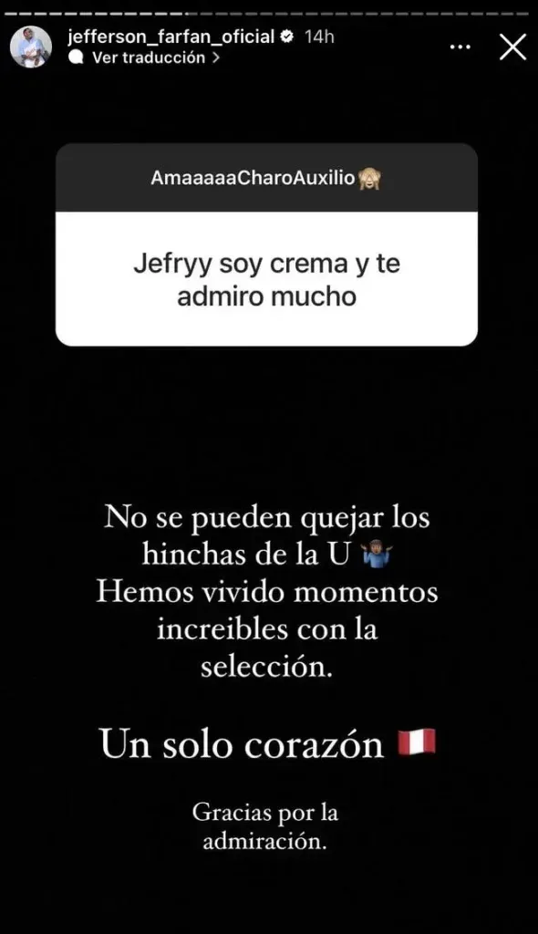 “No se pueden quejar los hinchas de la ‘U’, hemos vivido increíbles momentos con la selección. Un solo corazón. Gracias por la admiración”, respondió.