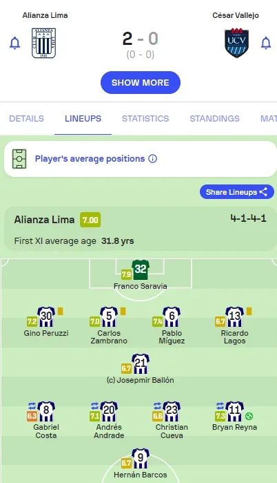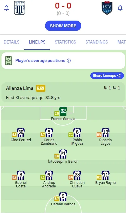 Dueño de esta nefasta estadística, los números de Cueva con Alianza en el primer tiempo no son los mejores. Valorado con un 6.6 por SofaScore, el volante tuvo 29 toques del balón, 21 pases precisos de 23 y 2 duelos ganados de 4.