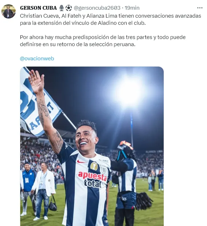 “Christian Cueva, Al Fateh y Alianza Lima tienen conversaciones avanzadas para la extensión del vínculo de Aladino con el club”, comentó Cuba.