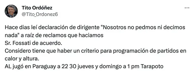 “Hace días leí la declaración de dirigente: “Nosotros no pedimos ni decimos nada” a raíz de los reclamos que hacíamos. Sr. Fossati de acuerdo, considero que tiene que haber un criterio para la programación de partidos en calor y altura. Alianza. jugó en Paraguay a las 22:30 del jueves y domingo a las 13:00 en Tarapoto”, precisó.