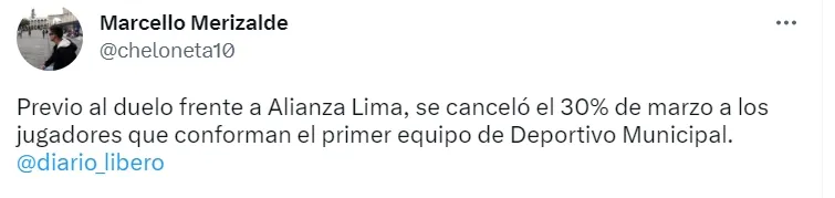 Así pues, según el periodista Marcello Merizalde, el cuadro de Deportivo Municipal recibió el 30% de marzo, para que puedan jugar más positivos ante Alianza.