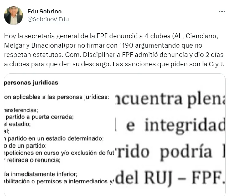 Revelado por el periodista Edu Sobrino, el hombre de prensa confirmó la información y alcanzó las posibles sanciones.