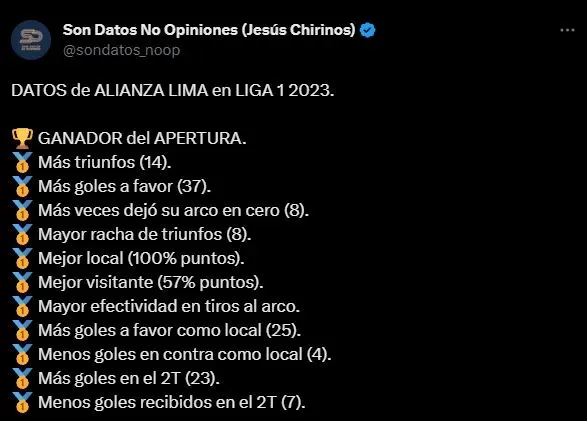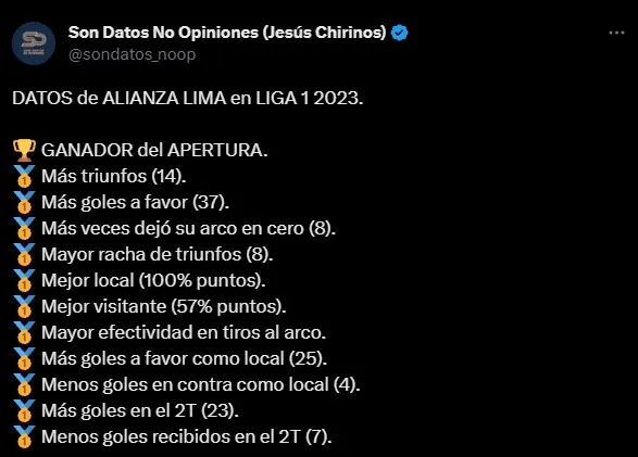 La fuente como siempre es Son Datos No Opiniones (Jesús Chirinos). Que relata así lo que logró Alianza Lima este Torneo Apertura: “GANADOR del APERTURA. Más triunfos (14). Más goles a favor (37). Más veces dejó su arco en cero (8). Mayor racha de triunfos (8). Mejor local (100% puntos). Mejor visitante (57% puntos). Mayor efectividad en tiros al arco. Más goles a favor como local (25). Menos goles en contra como local (4). Más goles en el 2T (23). Menos goles recibidos en el 2T (7)”.