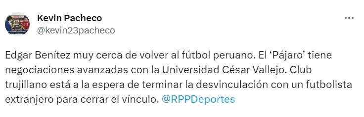 Así pues, Kevin Pacheco reveló que la Universidad César Vallejo está tramitando el fichaje de Edgar Benitez.