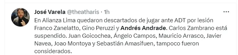 Toda esta información la dio el periodista José Varela a través de su cuenta de Twitter. En ella el hombre de prensa mencionó a los jugadores que no estarán.