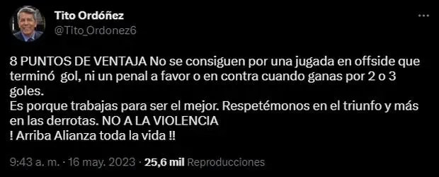“Ocho puntos de ventaja no se consiguen por una jugada en offside que terminó gol, ni un penal a favor o en contra cuando ganas por 2 o 3 goles. Es porque trabajas para ser el mejor. Respetémonos en el triunfo y más en las derrotas”, sostuvo el delegado del combinado blanquiazul en su cuenta de Twitter.