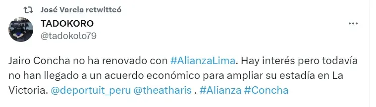 “Jairo Concha no ha renovado con Alianza Lima“, comenzó la cuenta de Twitter de Tadokoro.
