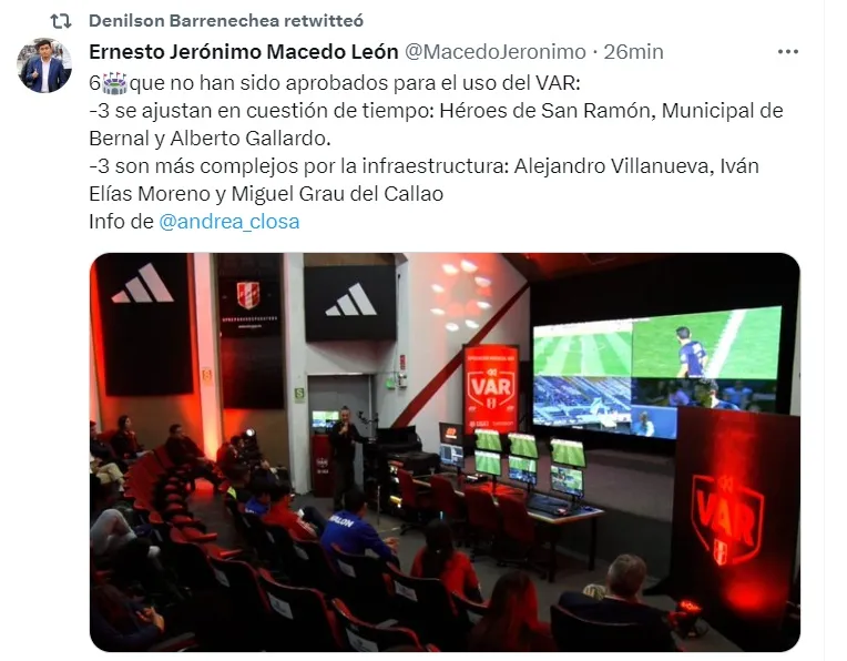En esa misma lista está Alianza Lima, que según la FPF, Matute no tiene las condiciones para la implementación del VAR por su infraestructura.