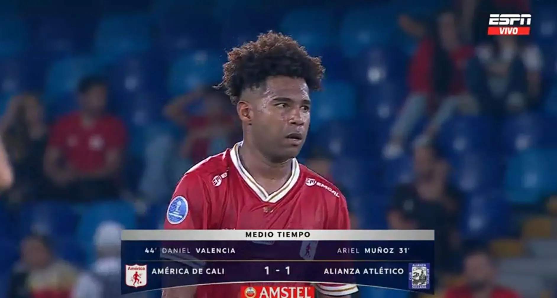 América de Cali y Alianza Atlético empatan 1-1 al término del primer tiempo tras los goles de Elian Muñoz y Daniel Valencia. También hay que mencionar que Román Gastón y Tomás Ángel tienen cartulinas amarillas en el partido que se viene jugando en el estadio Pascual Guerrero.