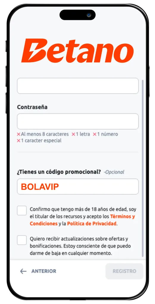 En el momento de completar tu registro o abrir una cuenta nueva en Betano e ingresar el código BOLAVIP, obtendrás ventajas exclusivas para apuestas deportivas o casino.