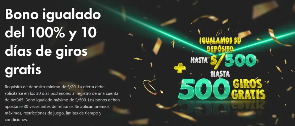 El bono de bienvenida bet365 Perú para casino te ofrece la opción de conseguir 100% hasta S/500 y adicional 10 días de giros gratis.