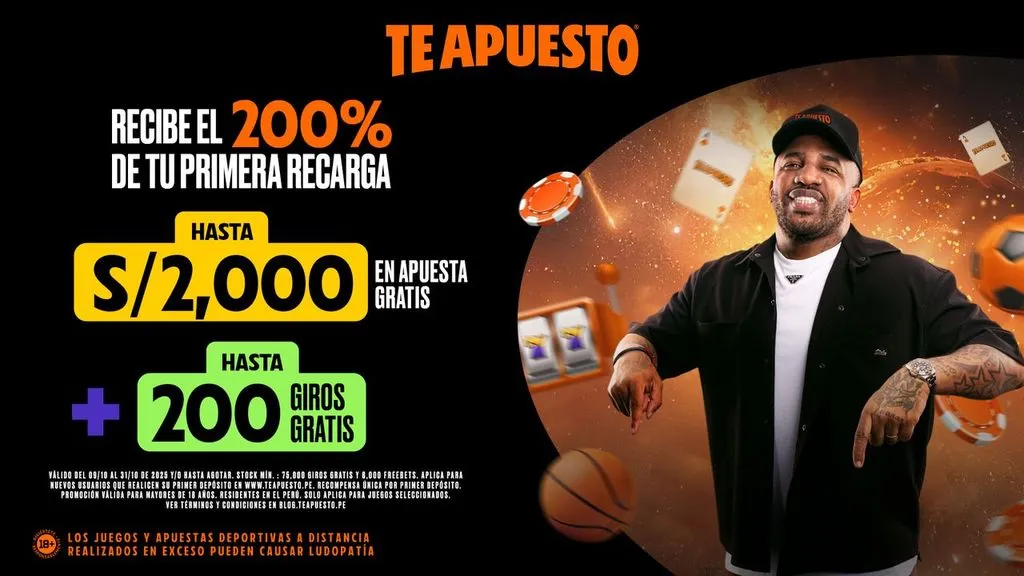 | Bono primera recarga para deportes. | 200% de tu primer depósito hasta $2,000 en Freebets | Importante la mayoría de edad. Recarga mínima de S/20.00, realizada dentro de los siguientes 7 días de su registro. Las freebet y giros gratis se entregarán según el monto del primer depósito, con un máximo de S/ 2,000 en freebet y 200 giros gratis. Los juegos aplicables varían según el rango depositado. | Obtén el bono |