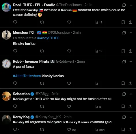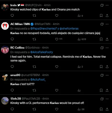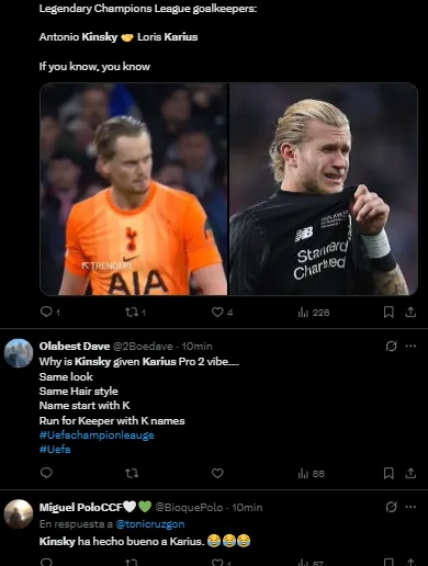 Loris Karius se volvió tendencia en X (Twitter) a raíz del error y la posterior sustitución de Antonín Kinský. Muchos utilizaron su caso para compararlo con lo sucedido con el checo de Tottenham, quien hacía su debut en un partido de la UEFA Champions League.