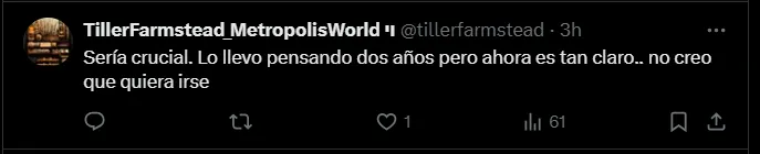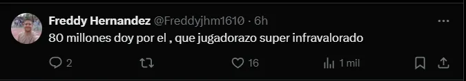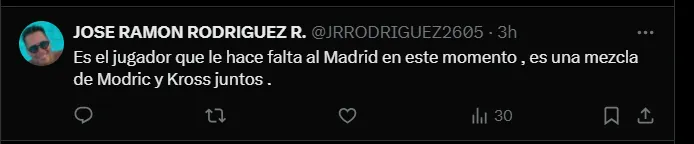 “80 millones doy por él. Qué jugadorazo super infravalorado”, “Es que no sé a qué esperan, sinceramente es todo lo que necesitamos”, “Sería crucial. Lo llevo pensando dos años, pero ahora es tan claro. No creo que quiera irse” y “Es el jugador que le hace falta al Madrid en este momento. Es una mezcla de Modric y Kross juntos”; señalaron los hinchas del Real Madrid por medio de ‘X‘.