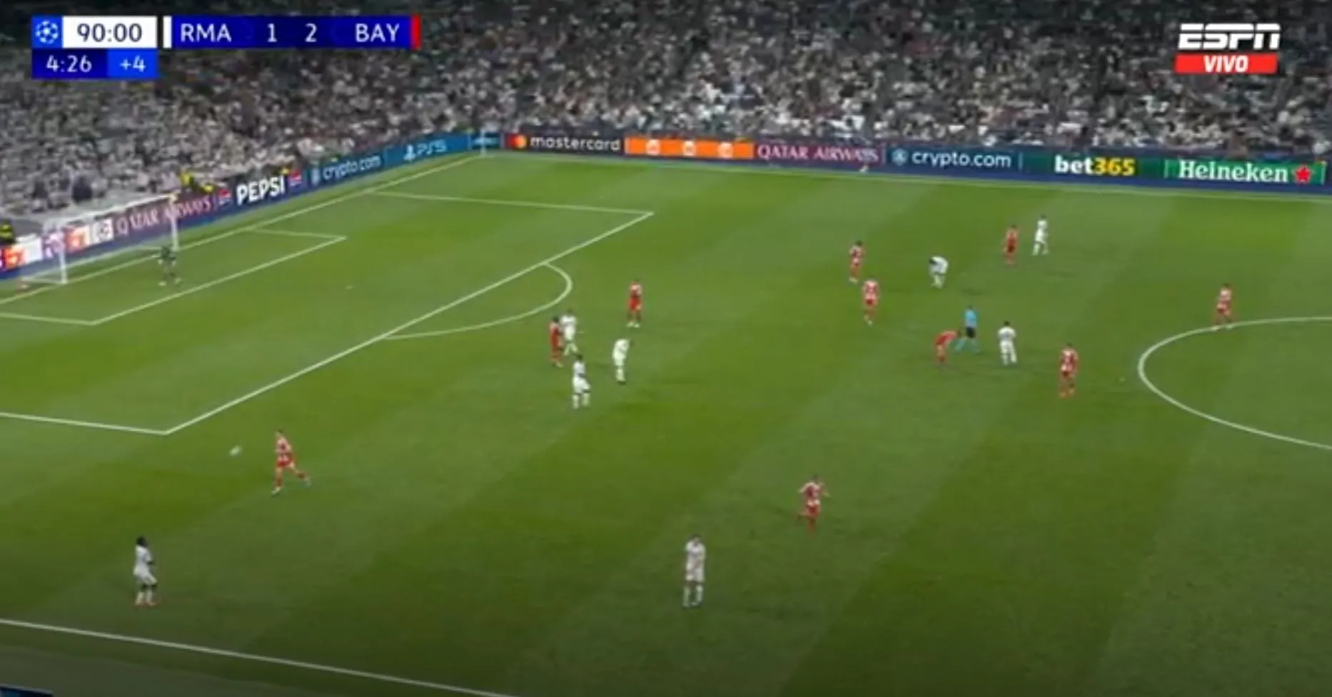 Ganando una pelota en salida del Bayern Múnich, Real Madrid presionó todo para recuperar la pelota y ganar un tiro indirecto. Al final no prosperó, pero se ve que los locales están dejando hasta el alma en cada acción.