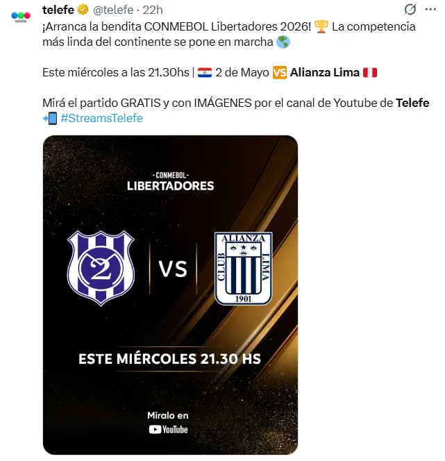 Buenas noticias para los hinchas de Alianza Lima de cara a su debut internacional, ya que el partido de ida ante 2 de Mayo de Paraguay por la Fase 1 de la Copa Libertadores 2026 podrá verse totalmente gratis por YouTube, una opción que amplía de manera masiva el acceso al encuentro.