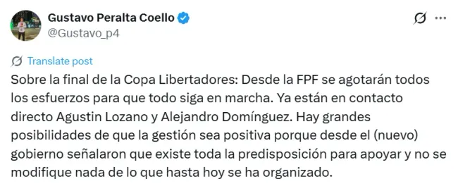 “Desde la FPF se agotarán todos los esfuerzos para que todo siga en marcha. Ya están en contacto directo Agustín Lozano y Alejandro Domínguez”, publicó Peralta en su cuenta.