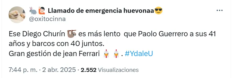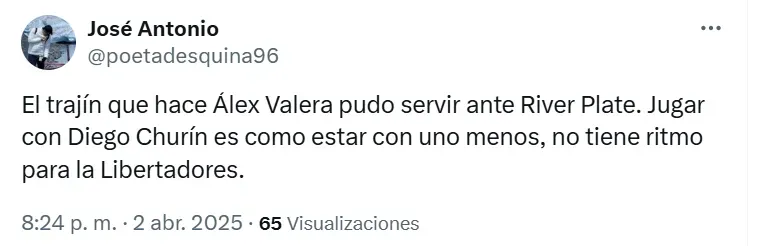 En la red social X llegaron las críticas más fuertes, como la de la cuenta @oxitocinna: “Ese Diego Churín es más lento que Paolo Guerrero a sus 41 años y Barcos con 40”. Otro usuario que también se quejó fue @poetadesquina96 con el siguiente mensaje: “El trajín que hace Álex Valera pudo servir ante River Plate. Jugar con Diego Churín es como estar con uno menos, no tiene ritmo para la Libertadores”.