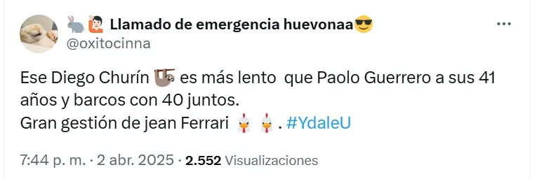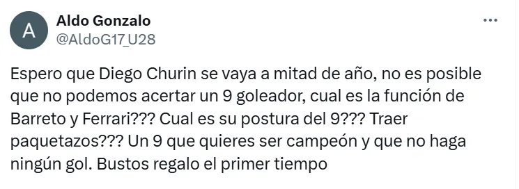 También el usuario @AldoG17_U28 se quejó fuerte sobre Diego Churín y pidió que se vaya de Universitario: “Espero que Diego Churín se vaya a mitad de año, no es posible que no podemos acertar un 9 goleador. ¿Cuál es la función de Barreto y Ferrari? ¿Cuál es su postura del 9? ¿Traer paquetazos? Un 9 que quieres ser campeón y que no haga ningún gol. Bustos regalo el primer tiempo”.