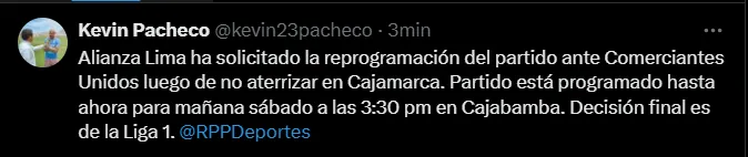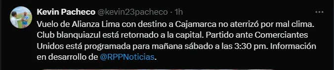 Alianza Lima sufrió complicaciones climáticas para aterrizar en la ciudad de Cajamarca el día de hoy en horas de la tarde y a raíz de dicha situación es que tuvieron que regresar a Lima. Ante ello, la directiva íntima ha solicitado la reprogramación del encuentro a jugarse el día de mañana 26 de abril a las 15:30 horas, así que la decisión está en manos de la Liga 1.