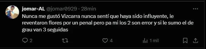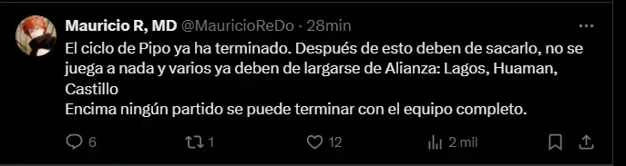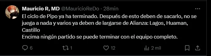 “Nunca me gustó Vizcarra, nunca sentí que haya sido influyente”, “El ciclo de Pipo ya ha terminado. Después de esto deben de sacarlo, no se juega a nada y varios ya deben de largarse de Alianza“, “Varias de las últimas expulsiones fueron por tapar errores de otros, sepan ver eso. Los suplentes no estaban a la altura” y “Ni se molesten en regresar”; son algunos de los comentarios más llamativos de los hinchas de Alianza Lima luego de la derrota de hoy ante Talleres de Córdoba.
