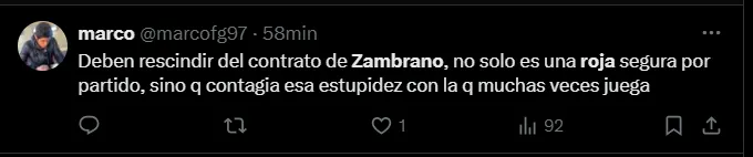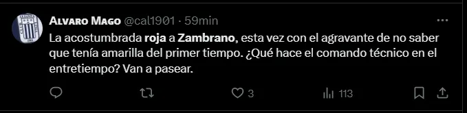 Siempre lo mismo, siempre”, “Deben rescindir del contrato de Zambrano, no solo es una roja segura por partido, sino que contagia esa estupidez con la que muchas veces juega” y “La acostumbrada roja a Zambrano, esta vez con el agravante de no saber que tenía amarilla del primer tiempo. ¿Qué hace el comando técnico en el entretiempo? Van a pasear”; sentenciaron los hinchas de Alianza Lima.