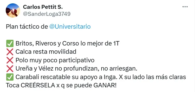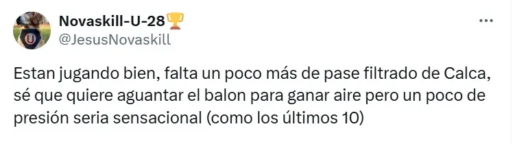 El usuario Carlos Pettit apuntó contra Horacio Calcaterra: “Plan táctico de Universitario: Bien Britos, Riveros y Corzo, lo mejor del primer tiempo. Mal Calcaterra, resta movilidad, Andy Polo muy poco participativo y Ureña como Vélez sin profundidad”. Jesús Novaskill también explotó: “Están jugando bien, falta un poco más pase filtrado de Calcaterra. Sé que quiere aguantar el balón para ganar aire, pero un poco de presión sería sensacional”.
