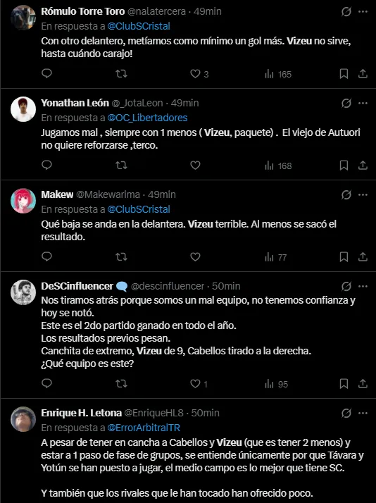 En las redes sociales se puede leer muchos comentarios en contra de Vizeu. Entre los que destacan que jugar con él es tener uno menos en la cancha, pues no le termina sumando al equipo. Otros consideran que debido a su nivel, con otro delantero tranquilamente pudieron haber hecho otro gol más al cuadro de Carabobo. Mientras que algunos ya no saben que hacer con el brasileño en el plantel titular.