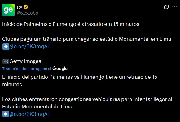 Como era de esperar, el cambio del horario de esta final se debe al acceso al estadio. Según lo que se ha conocido por el medio brasileño Globo, los equipos tuvieron algunos inconvenientes para poder llegar con facilidad al coloso de Ate. Por esa razón se ha determinado que el encuentro sufra un pequeño retraso para dar comienzo.