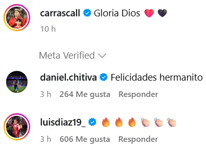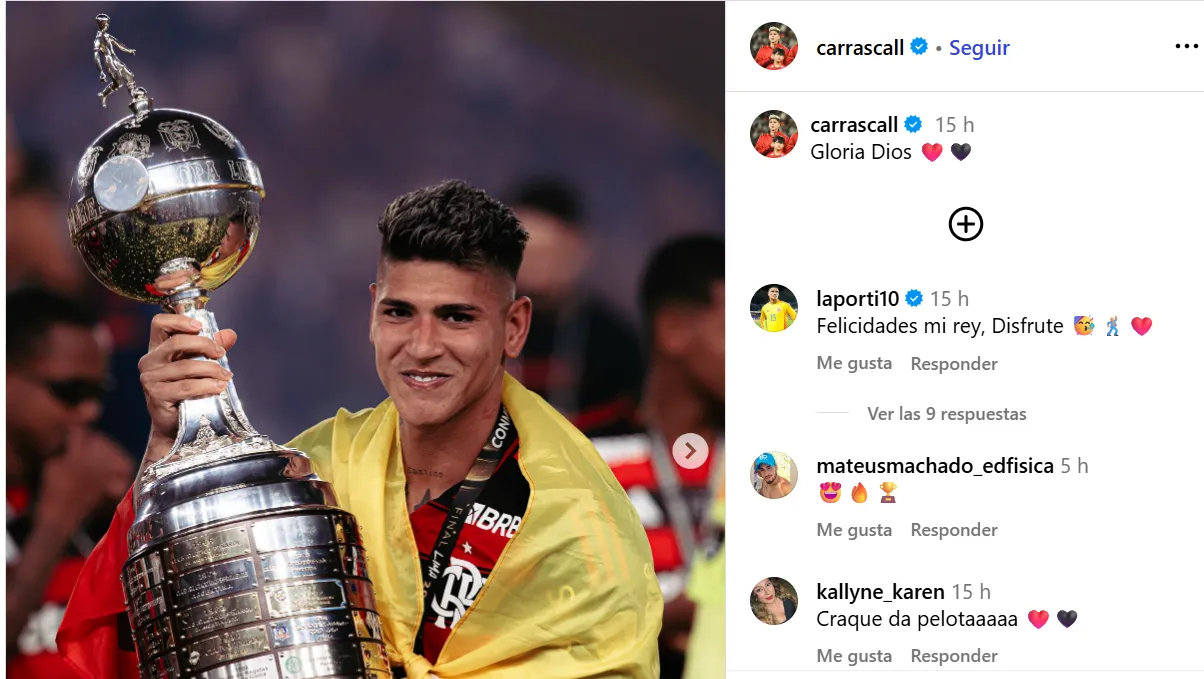 En la publicación se ve a Carrascal, jugador del ‘Fla’, posando con el trofeo de la Libertadores tras la final del certamen. Díaz no fue indiferente y respondió con emojis de fuego y aplausos, demostrando su alegría por la conquista del ‘Mengao’.